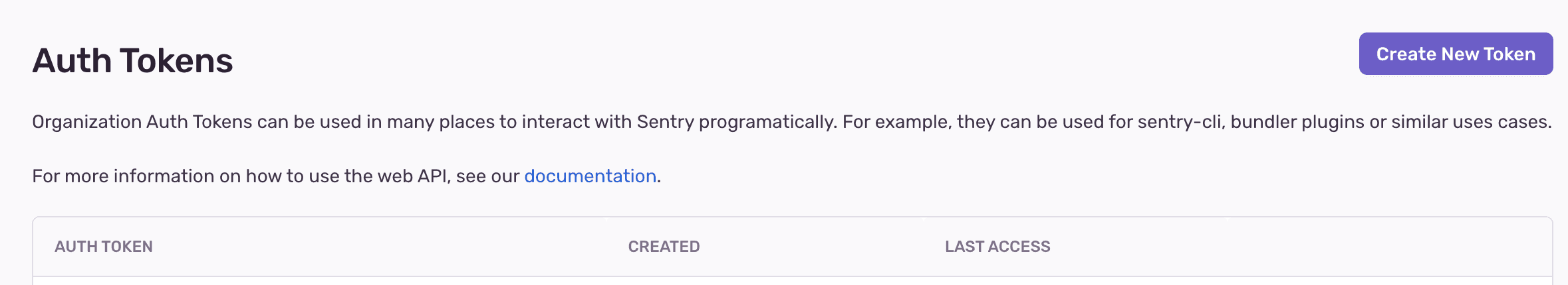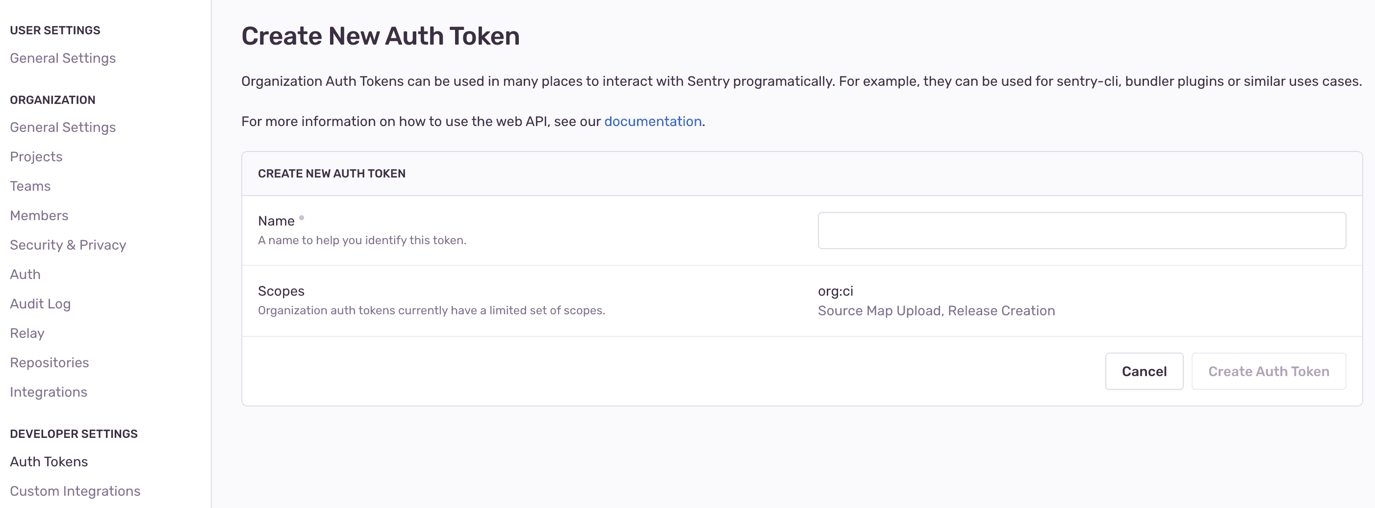 Sentry 에 수동으로 소스 맵을 업로드하기 위해선 인증 토큰 발급이 필요합니다.