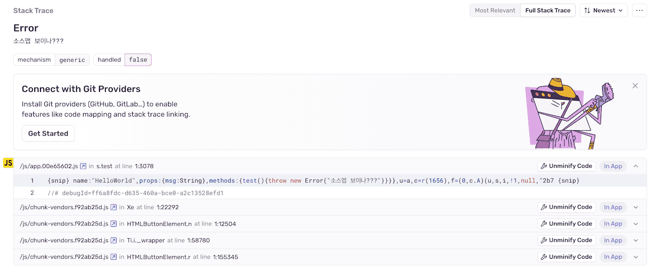 이러한 비효율적인 디버깅 플로우를 해결하기 위해 Sentry 에서는 소스 맵을 Sentry로 업로드할 수 있도록 지원하고 있습니다.